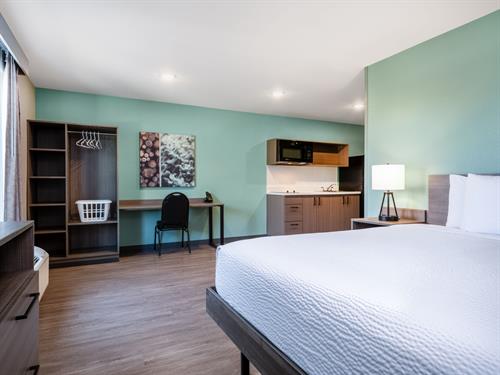 Thoughtfully designed extended stay hotel featuring all suites. Each suite is equipped with a kitchen featuring cooktop, microwave and full size refrigerator, along with essentials like a smart TV with streaming, casting and premium channels and free standard WiFi.